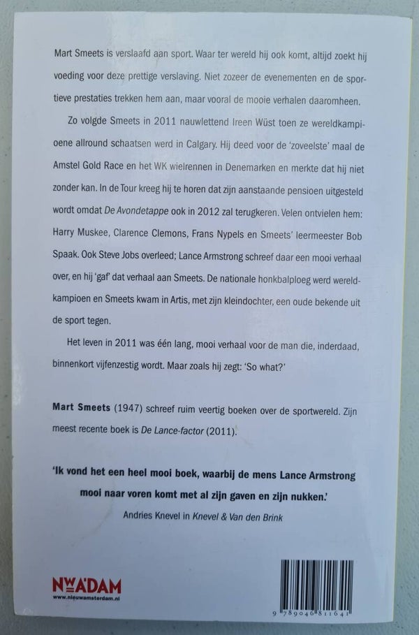 Mart Smeets is verslaafd aan sport. Waar ter wereld hij ook komt, altijd en overal zoekt hij voeding voor deze prettige verslaving. Het zijn niet zozeer de evenementen en de sportieve prestaties die hem aantrekken, maar vooral demooie verhalen van achter de schermen en van de sporters zelf. Ook in 2011 maakte Smeets veel mee. Zo volgde hij nauwlettend Robert Gesink in ee nmemorabele Tour de France. Hij zag de terugkeer van Sven Kramer op het ijs. Hij ervaarde hoe Theo Janssen het voetbal weer sexy maakte. En hoe LeBron James de NBA-finale verknalde. En er was veel meer omop terug te blikken. Met zijn enthousiasme, fenomenale sportkennis en anekdotische verteltrant schrijft Smeets wederom verhalen die de lezer weten te raken.
